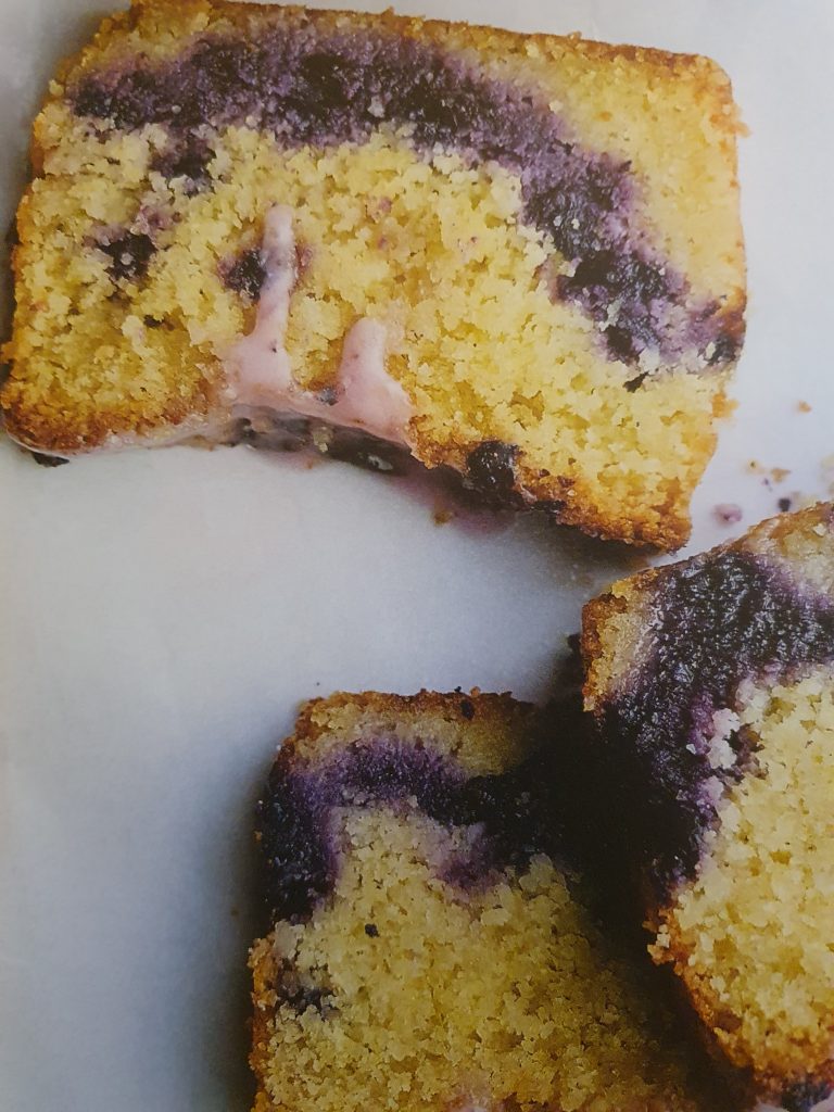 Tapissez un grand moule à cake de papier cuisson. Versez-y 1/4 de la pâte, recouvrez avec les myrtilles puis versez le reste de pâte.