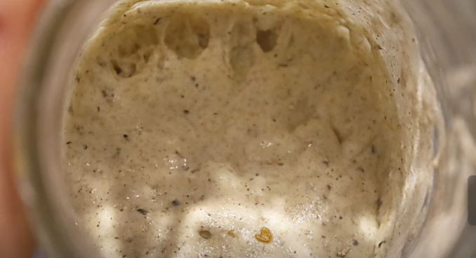 Le levain devrait être plein de bulles. Comptez 90 g de levain pour 350 g à 450 g de farine. N’oubliez pas de garder une partie du levain avant de faire votre préparation. Il se conserve 3 jours au frigo. Après, il a besoin d’être nourri. Pour utiliser un levain conservé au frigo, sortez-le 30 min à l’avance.